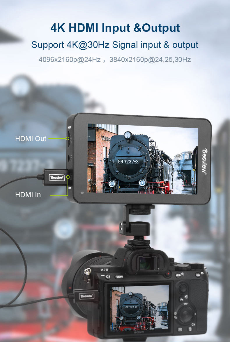 R6 UHB podpira vhod/izhod HDMI do ločljivosti 4K, zato ga lahko neposredno priključite na večino fotoaparatov DSLR ali