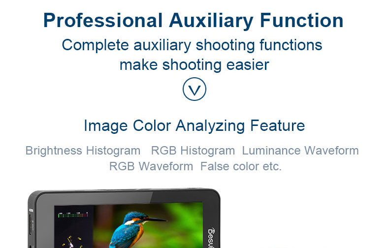 Za izboljšanje filmov je na voljo več funkcij monitorja, kot so lažne barve, zebra, histogram in valovna oblika,