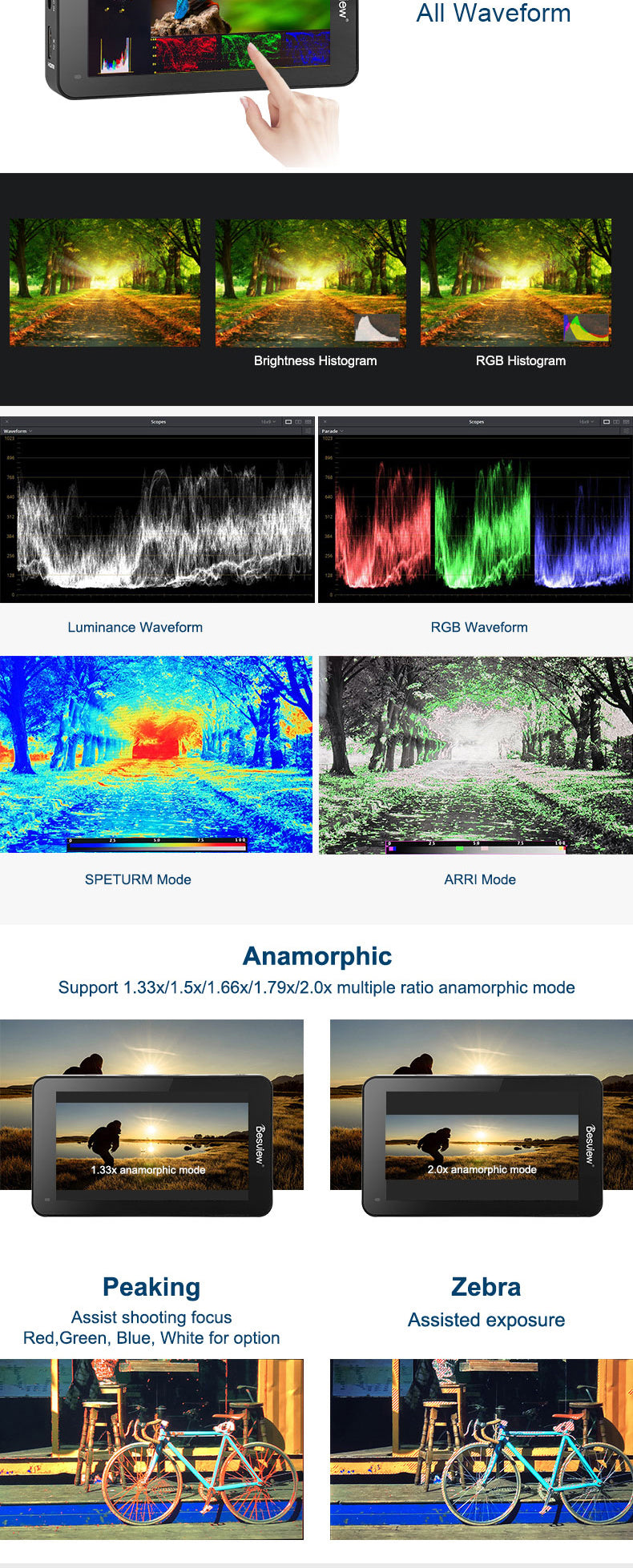 Vectorscope, All Wave, Single Color, Peaking in Safe Area za boljšo pomoč pri osvetlitvi, ostrenju in kompoziciji.