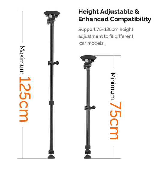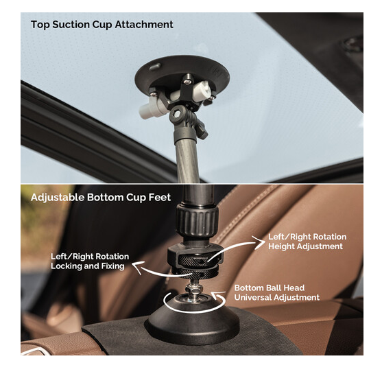 Nastavljiva teleskopska palica MOVMAX s 3-zobnim nosilcem je profesionalni sistem za pritrditev kamere v vozilu, zasnovan za čiste, brez vibracij posnetke iz vozila skozi vetrobransko steklo z uporabo akcijskih kamer, kot je GoPro. Robustna aluminijasta teleskopska palica se gladko nastavlja od 76 do 122 cm, da se prilagodi različnim velikostim kabine, in se varno zaklene na kateri koli dolžini. Zgornji del je opremljen z visoko trdno prisesno skodelico, ki se zanesljivo pritrdi na strešno okno ali steklo nad glavo, medtem ko se spodnji prisesni podstavek trdno pritrdi na sredinsko konzolo ali armaturno ploščo, kar zagotavlja trdno stabilnost med vožnjo z visoko hitrostjo ali vožnjo po terenu. Ta komplet vključuje kompletni sklop artikulacij: 3-kraki nosilec v slogu GoPro z integrirano kroglo, roko z dvojno kroglo za 360° premikanje in nagibanje ter namensko sponko z kroglo za pritrditev sekundarnih naprav ali natančno nastavitev kotov. Sistem je idealen za ustvarjalce avtomobilskih vsebin, snemalce motošporta in vlogerje, saj omogoča prilagodljivo namestitev kamere brez uporabe rok, z minimalno oviranostjo notranjosti in maksimalnim kreativnim nadzorom.