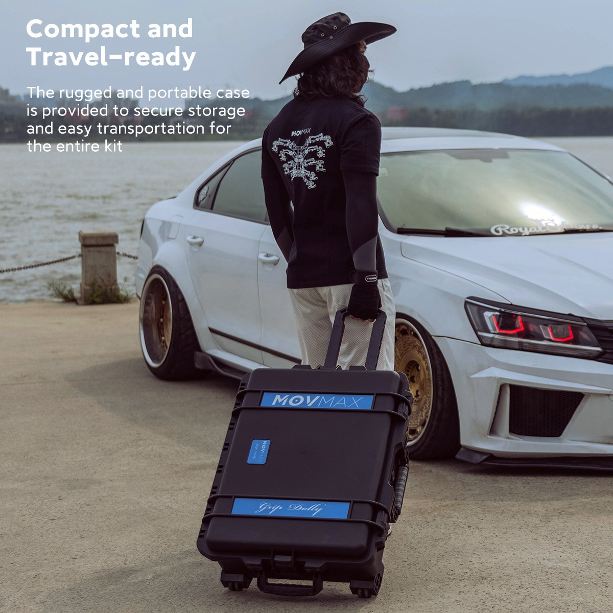 MOVMAX Grip Dolly Pro Kit je sistem vozičkov za težka bremena z nosilnostjo 198 funtov. Vključuje ploščato ploščo, 75/100/150 mm kroglaste adapterje, Mitchellov ploščati adapter in polimerna kolesa za stabilno gibanje. Voziček ima več navojev 1/4"-20 in 3/8"-16, srednje in stranske podpore ter je opremljen s kovčkom za enostaven prevoz in shranjevanje.