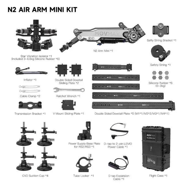 MOVMAX N2 Air Arm Mini Kit je celovita rešitev, zasnovana za povečanje stabilnosti in natančnosti pri snemanju filmov in videoposnetkov. Ta komplet vključuje mini zračno roko N2 Air Arm Mini, znano po lahki in vzdržljivi konstrukciji, ki zagotavlja gladko in nadzorovano premikanje kamere. Komplet je idealen za profesionalne filmske ustvarjalce, saj zagotavlja zanesljivo delovanje v različnih pogojih snemanja ter omogoča dinamične in kakovostne posnetke. Komplet MOVMAX N2 Air Arm Mini je nujen za tiste, ki želijo izboljšati svoje produkcijske zmogljivosti z izboljšanim nadzorom in vsestranskostjo.