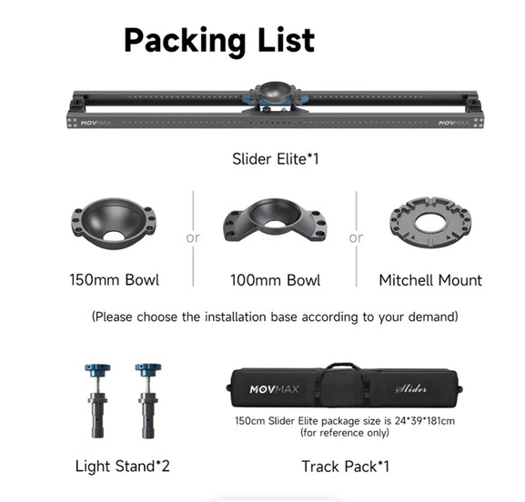 MOVMAX Slider Elite 35" z Mitchell Mount omogoča izjemno gladko in tiho ročno drsenje po 35,4-palčnih robustnih aluminijastih tirnicah s torzijskim vozičkom, ki podpira do 55,1 lb, opremljenim z Mitchellovo ploščato podlago za profesionalne kamere in dvojnimi 5/8" stojalnimi adapterji – v kompletu z zavornimi/blažilnimi gumbi in torbo za enostaven prevoz in kinematografsko sledenje na snemalnem prizorišču.
