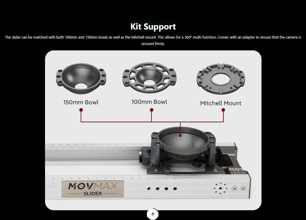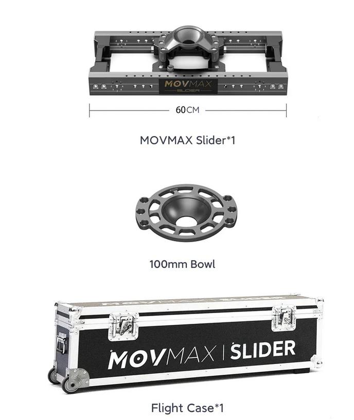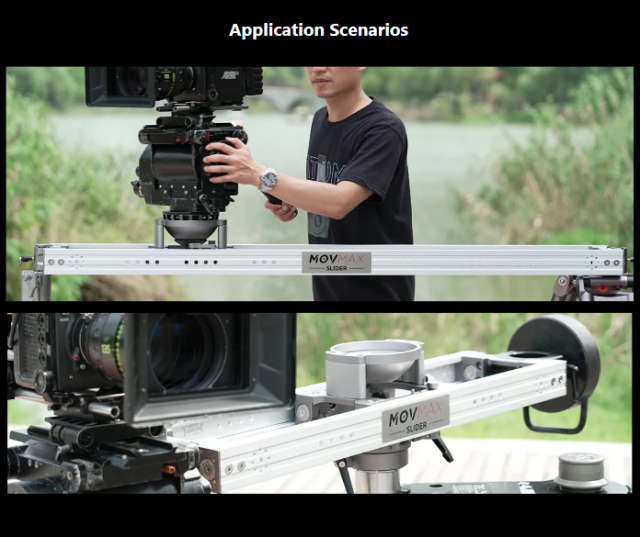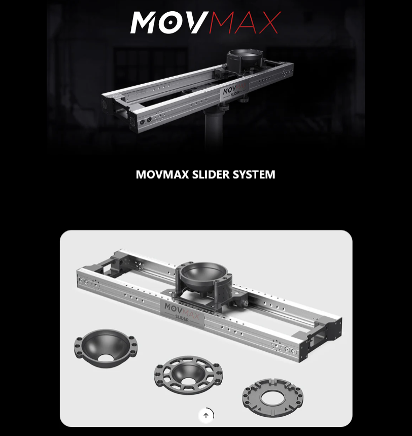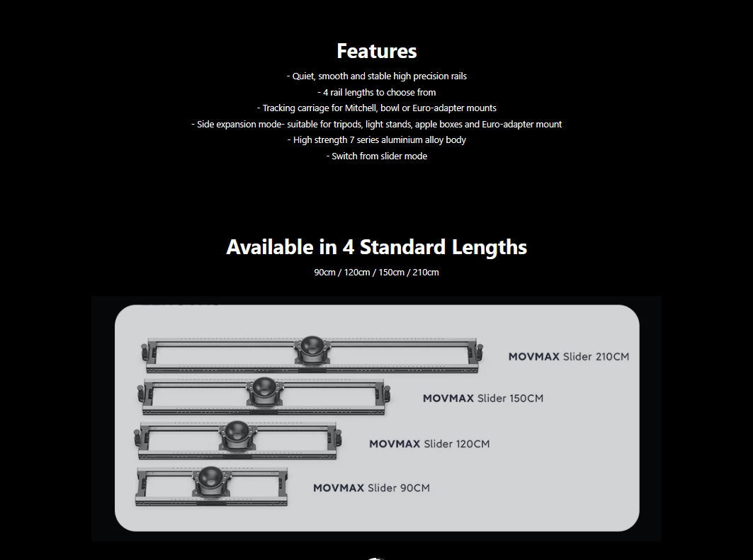MOVMAX Slider System je natančno izdelan drsnik za kamero, zasnovan za profesionalno kinematografijo, ki je na voljo v dolžinah 60 cm, 90 cm, 120 cm, 150 cm, 180 cm in 210 cm. Ima tihe, gladke in visoko natančne vodilne letve, stranski razširitveni način za uporabo s stativi ali svetlobnimi stojali ter je združljiv s 100 mm/150 mm skodelicami ali Mitchellovim nosilcem, vse to pa je vgrajeno v robustno ohišje iz aluminijeve zlitine serije 7.