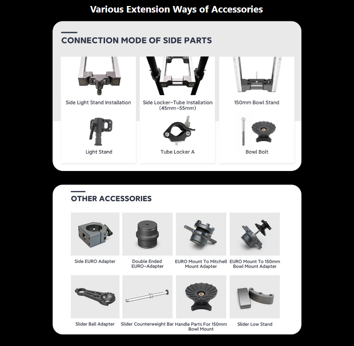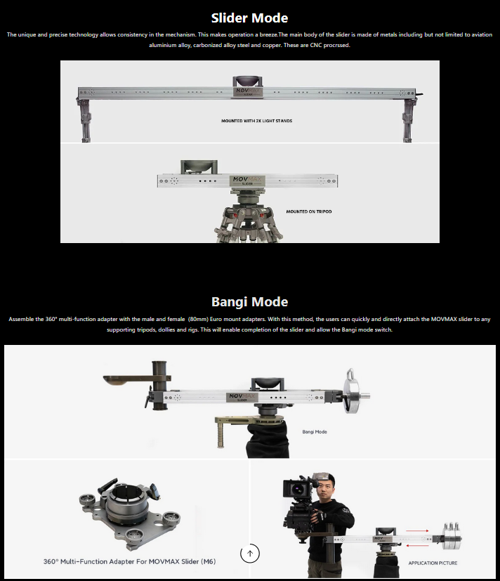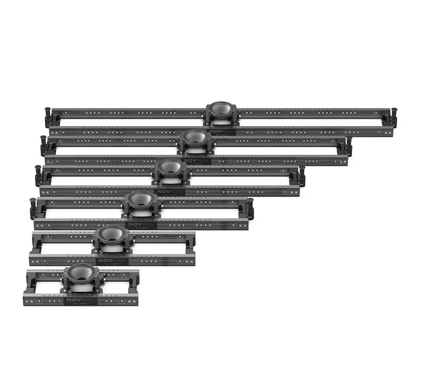 Sistem MOVMAX Slider, zasnovan za potrebe profesionalnega filmskega ustvarjanja, zagotavlja izjemno stabilnost in tekoče gibanje v različnih dolžinah – 60 cm, 90 cm, 120 cm, 150 cm, 180 cm in 210 cm –, kar ga naredi idealnega za različne scenarije snemanja. Vozik drsnika podpira Mitchellove, 100-milimetrske in 150-milimetrske nosilce, kar omogoča 360-stopinjsko večfunkcionalno delovanje v kombinaciji s 360-stopinjskim adapterjem. Njegova uporaba v dvojnem načinu omogoča nemoteno preklapljanje med načinom drsnika, ki vključuje ultra natančne CNC-obdelane aluminijaste, jeklene in bakrene komponente za gladko gibanje, in načinom Bangi, ki drsnik prilagaja za uporabo s stativi, vozički ali napravami prek Euro-mount adapterjev. Izdelan je iz visoko trdne aluminijeve zlitine serije 7, ki se uporablja v letalstvu, in ponuja trajnost, togost in dosledno delovanje. Način stranskega razširjanja omogoča namestitev na svetlobne stojala, apple boxe ali Euro-adapterje za vsestranske nastavitve. MOVMAX Slider je profesionalno orodje, zasnovano za natančno, kinematografsko gibanje v vsakem produkcijskem okolju.