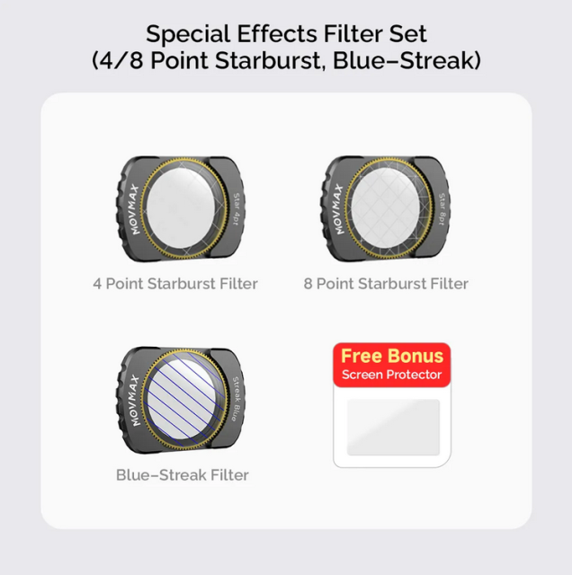 Komplet filtrov za posebne učinke MOVMAX za DJI Pocket 3 sprošča kinematografsko ustvarjalnost s 4-točkovnimi in 8-točkovnimi filtri za zvezdni razpon, ki svetlobne vire, kot so ulične svetilke in žarometi, pretvarjajo v bleščeče zvezdne vzorce, ter filtrom Blue Streak za znanstvenofantastične modre proge okoli gibljivih luči v nočnih prizorih – vse to prek magnetnega sistema za enostavno zamenjavo med dinamičnim snemanjem.