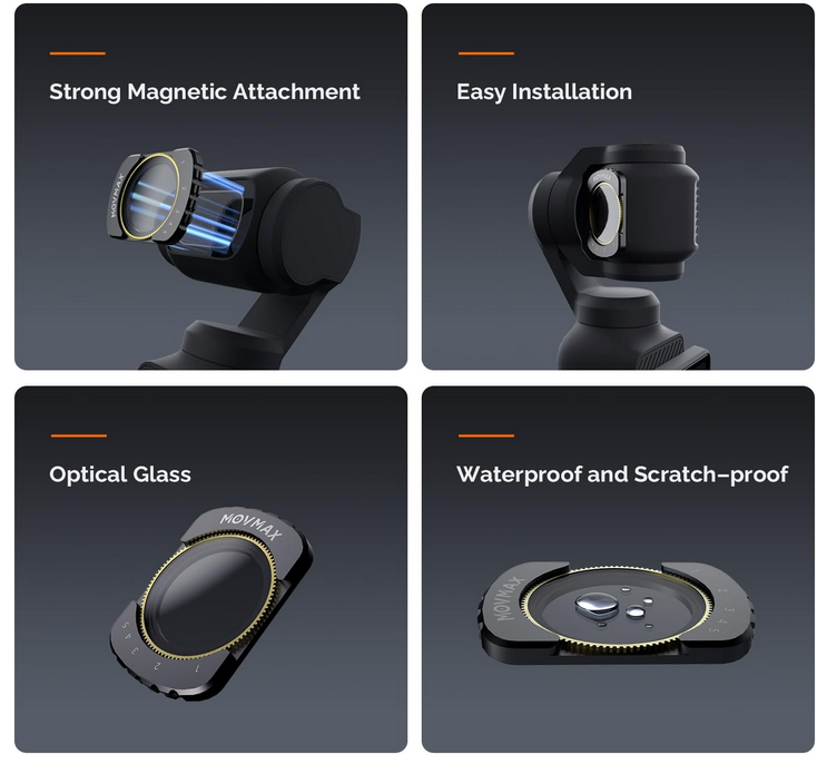 Sada magnetických filtrů MOVMAX pro DJI Osmo Pocket 3 Creator Combo obsahuje variabilní filtr ND2-32 (1–5 clonových stupňů), otočný filtr CPL a difuzní filtr Black Mist 1/4 – všechny se magnetickým uchycením pro okamžité použití – plus ochrannou fólii na LCD displej, které zajišťují filmovou kontrolu, jas bez odlesků…