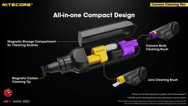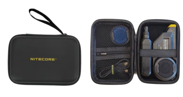 Komplet Nitecore BlowerBaby Kit vključuje Nitecore BlowerBaby, antistatični filter za zaščito senzorjev fotoaparata, krtačko za čiščenje in torbico za prenašanje.
