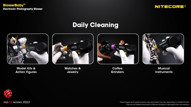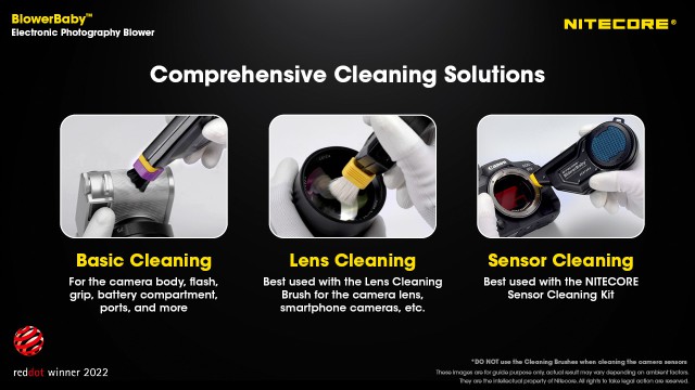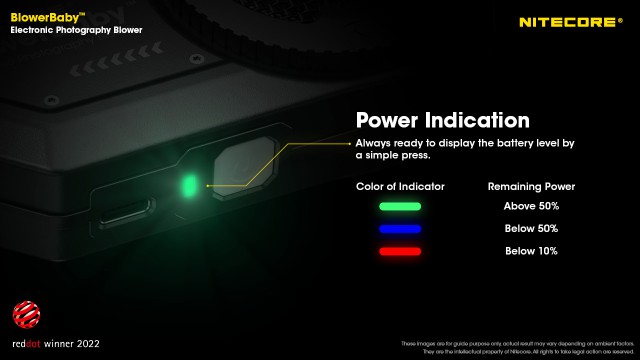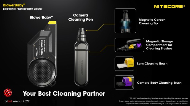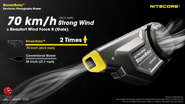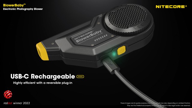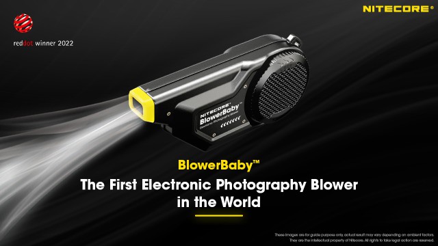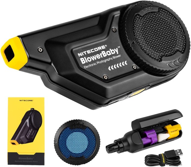 Nitecore BlowerBaby je brezžični pihalnik, ki je zasnovan posebej za fotografsko in filmsko opremo, seveda pa se lahko uporablja tudi za čiščenje računalnikov, tipkovnic in druge elektronike. Zmogljiv motor (26 000 vrtljajev na minuto) in vgrajena 1500 mAh baterija s 15-minutnim neprekinjenim delovanjem ter indikatorjem stanja LED zlahka odstranita prah in drobne ostanke. Polni se prek USB-C v približno 1,5 h.