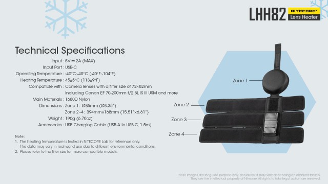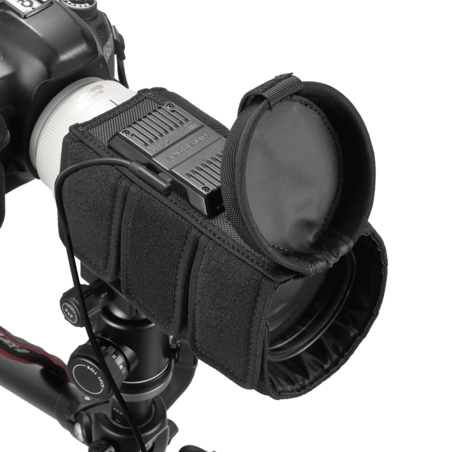 Ogrevana zaslonka objektiva je nujna dodatna oprema pri fotografiranju pri nizkih temperaturah in/ali v okoljih z visoko vlažnostjo, kjer je bistvena zaščita pred zamegljevanjem objektiva. V celoti obdaja objektiv (s premerom filtra približno 72 ~ 82 mm) in tako zagotavlja največjo toplotno zaščito, saj ga segreje na približno 45 °C (temperaturo doseže v približno 10-15 minutah). Najlonski pokrov prenese temperature od -40-40 °C in je opremljen z vmesnikom USB-C za napajanje (največ 5 V/2 A) z zunanjimi napajalniki, vključno z baterijami (niso priložene), ter priloženim 1,5-metrskim kablom USB-A/USB-C z lomljenimi priključki, ki prenese temperature do -20 °C. Idealen pripomoček za dokumentarne posnetke, astrofotografijo itd