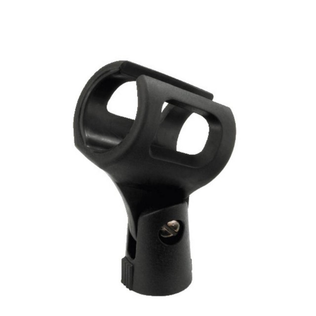 Držalo za mikrofon iz črne prožne toge plastike s premerom od 32 do 42 mm. Primerno za brezžične ročne mikrofone z večjim ročajem, z enim standardnim 16 mm (⅝") navojem.