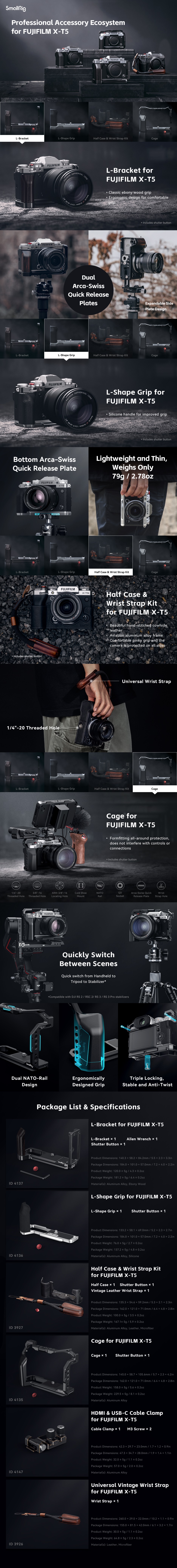 Nosilec SmallRig L za fotoaparat FUJIFILM X-T5 4137 je zasnovan tako, da olajša preklapljanje med vodoravnim in navpičnim načinom ter izboljša izkušnjo držanja. Fotoaparat pritrdi z enim vijakom 1/4"-20 in enim pozicijskim zatičem na dnu, z gumijastimi blazinicami za preprečevanje prask ter omogoča popoln dostop do gumbov, rež za kartice, predala za baterijo…