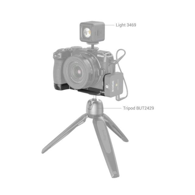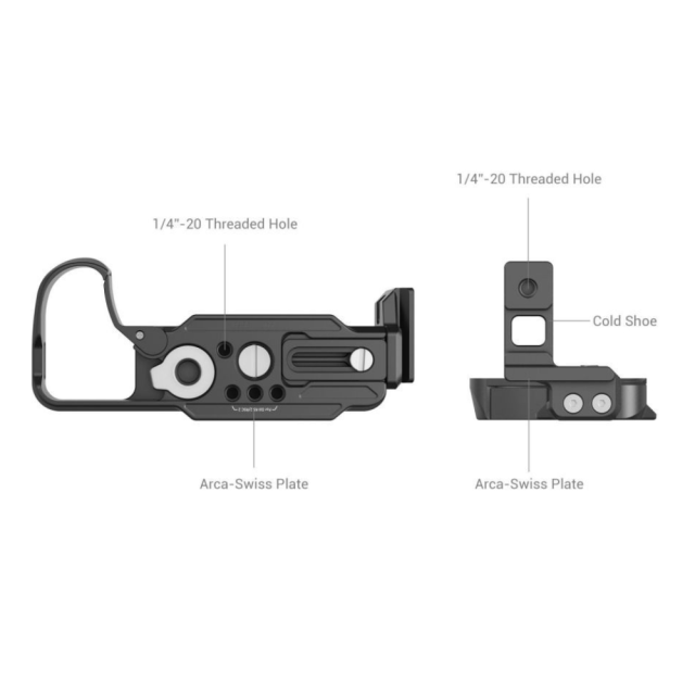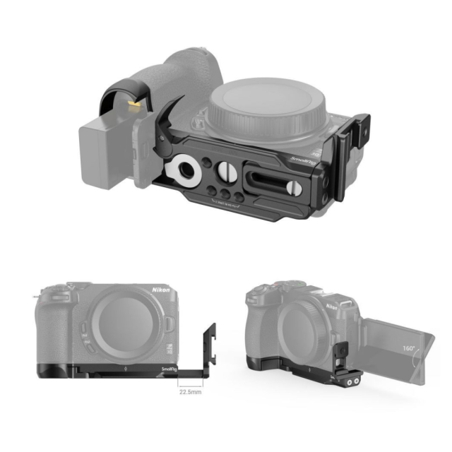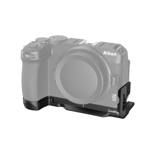 Držalo SmallRig L za Nikon Z 30 3860 je zasnovano tako, da olajša vodoravno in navpično fotografiranje ter izboljša izkušnjo držanja. Nosilec L, ki se pritrdi na dno fotoaparata z vijakom 1/4"-20, ima podložke, ki preprečujejo praske in zvijanje. Na vratih za baterijo je tečajna roka, ki se prilagaja ukrivljenosti fotoaparata, kar omogoča udobno držanje in lažjo menjavo baterije. Osnovna plošča in stranska plošča imata ploščico za hitri sprožilec Arca-Swiss za stativ Arca-Swiss za vodoravno in navpično fotografiranje. Zlasti stranska plošča ima hladno podnožje za mikrofon, lučko LED in jo je mogoče podaljšati, da lahko skozi njo potekajo kabli, ter prevračalni zaslon, ki se vrti za 160°; spodnje luknje z navojem 1/4"-20 za ploščico za hitro sprostitev (zgoraj) stabilizatorja DJI RS 2 / RSC 2 / RS 2 / RS 3 / RS 3 Pro ali stativa, luknje za ročni trak modela 3848 in vgrajen izvijač s ploščato glavo za hitro sprostitev dodatne opreme.