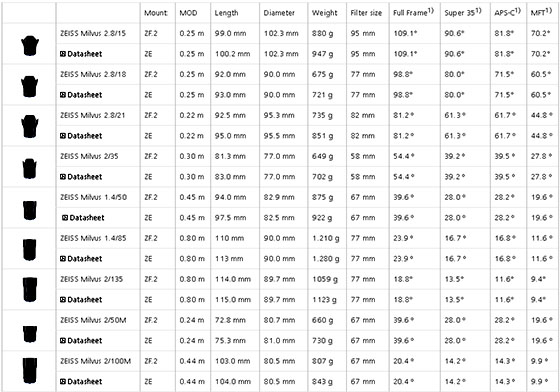 Kolesce ZEISS Lens Gear za namestitev daljinskega ostrenja ne potrebuje orodja in je na voljo v štirih različnih velikostih: mini (62-69 mm, 60-67 mm z gumijasto blazinico GumGum), mali (71-77 mm, 69-75 mm z gumijasto blazinico GumGum), srednji (78-84 mm, 76-82 mm z gumijasto blazinico GumGum) in veliki (86-93 mm, 84-91 mm z gumijasto blazinico GumGum). Priložena je tudi gumijasta blazinica "GumGum" z lepljivo površino za zmanjšanje notranjega premera in/ali zaščito obroča za ostrenje objektiva. Tabela združljivosti za objektive Zeiss Otus, Milvus in Loxia je na voljo tukaj.