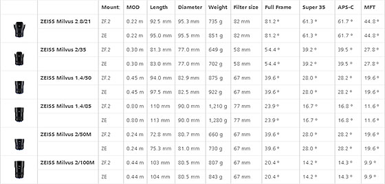 Kolesce ZEISS Lens Gear za namestitev daljinskega ostrenja ne potrebuje orodja in je na voljo v štirih različnih velikostih: mini (62-69 mm, 60-67 mm z gumijasto blazinico GumGum), mali (71-77 mm, 69-75 mm z gumijasto blazinico GumGum), srednji (78-84 mm, 76-82 mm z gumijasto blazinico GumGum) in veliki (86-93 mm, 84-91 mm z gumijasto blazinico GumGum). Priložena je tudi gumijasta blazinica "GumGum" z lepljivo površino za zmanjšanje notranjega premera in/ali zaščito obroča za ostrenje objektiva. Tabela združljivosti za objektive Zeiss Otus, Milvus in Loxia je na voljo tukaj.