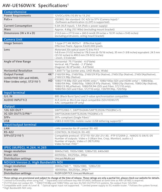Panasonic AW-UE160W/K je namestitvena kamera 4K naslednje generacije, zasnovana za čiščenje oddaj v živo v najvišji kakovosti! Novi paradni konj Panasonicove flote PTZ ponuja prilagodljivost daljinsko vodenih namestitvenih kamer ter kakovost slike in funkcije studijskih in filmskih modelov. Z dodatno programsko opremo AW-SFU60 je tudi prva kamera PTZ na trgu, ki podpira standard SMPTE ST2110 IP! V prodaji od 1. četrtletja 2023.