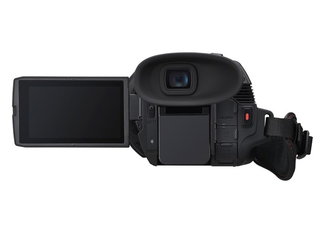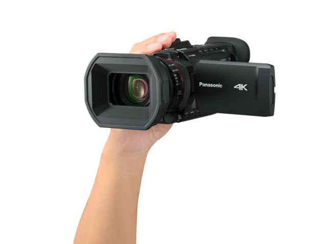Polprofesionalna videokamera 4K - kompaktna in lahka, s snemanjem 60p, 25 mm širokokotnim objektivom, 24-kratno optično povečavo in velikim iskalom OLED. Na voljo od aprila 2025.