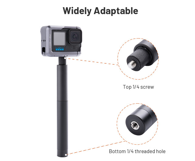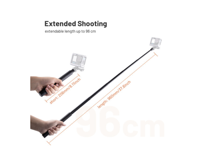 Palica se razteza od zaprte dolžine 20,6 cm do maksimalne raztegnjene višine 96 cm, kar omogoča prilagodljive možnosti kadriranja za različne scenarije snemanja. Ta palica za selfije je združljiva z vsemi fotoaparati s standardnim pritrdilnim vijakom 1/4"-20 in zagotavlja univerzalno združljivost brez ploščice za hitro sprostitev.