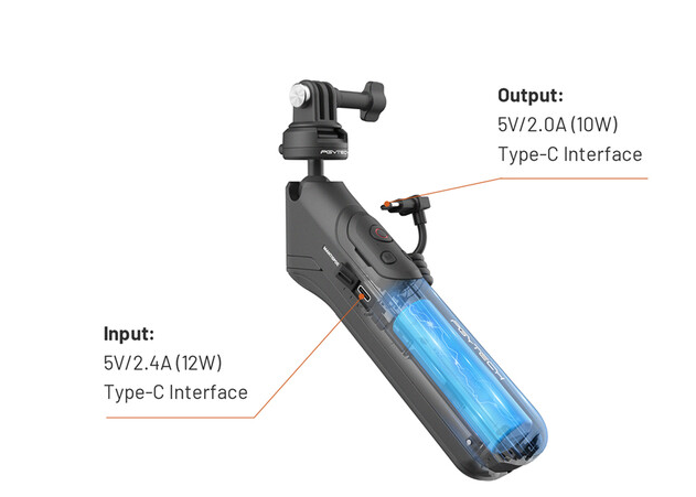 Napaja ga vgrajena 5000 mAh polnilna litijeva baterija 21700, ki omogoča hkratno snemanje in polnjenje ter zagotavlja do 25 ur delovanja baterije. Hitro polnjenje je mogoče prek vhoda USB-C 5V/2,4A, izhod 5V/2,0A pa lahko napaja naprave do 10 W. Priloženi večfunkcijski daljinski upravljalnik poenostavi upravljanje kamere za fotografiranje in snemanje videa. Patentirani sistem hitrega sprostitev CapLock z dvojno zaporo zagotavlja varno in hitro namestitev kamer ali telefonov, medtem ko zasnova kavlja omogoča raznolike položaje za obešanje med snemanjem v načinu Mantis.