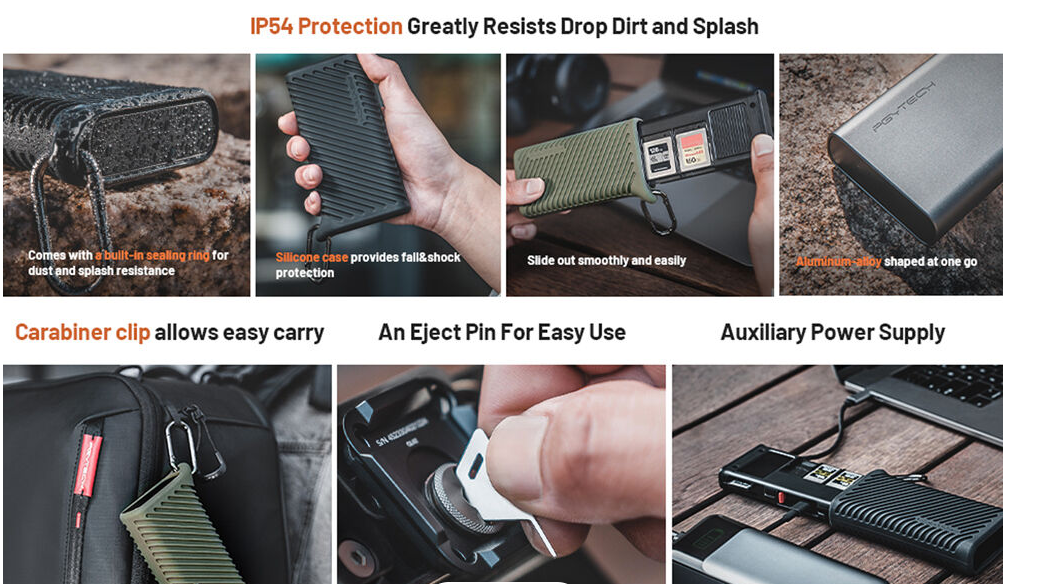 Aluminijasto ohišje s silikonsko zaščito in tesnilnim obročem, ki je skladno s standardom IP54, ščiti pred padci, prahom in brizganjem, karabiner pa omogoča enostavno pritrditev na torbe. Pomžni USB-C napajalni priključek (5 V/2 A) zagotavlja stabilen prenos podatkov. Združljivost plug-and-play se razteza na naprave Windows, macOS, Linux, Android in iPadOS, kar olajša prenos podatkov iz fotoaparatov, dronov ali akcijskih kamer na vaše naprave. Kompaktno, lahko in zelo trpežno ohišje za čitalnik kartic je vsestranska rešitev za upravljanje vaših medijev na poti.