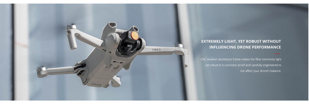 Filter je izdelan iz japonskega optičnega stekla AGC z dvojnim premazom, kar zagotavlja minimalno refrakcijo in izjemno optično jasnost. Lahki, a robustni CNC aluminijasti okvir je odporen proti koroziji in zasnovan tako, da med letom ohranja ravnotežje drona. Dvostranski premaz ga naredi vodoodpornega, odpornega proti olju in praskam, kar zagotavlja trajnost in dolgotrajno delovanje. Z zmanjšanjem svetlobe za 1 stopnjo omogoča nadzorovano osvetlitev v svetlih pogojih.