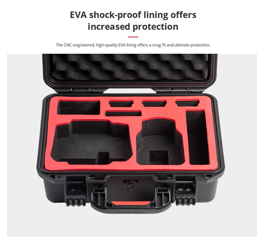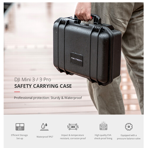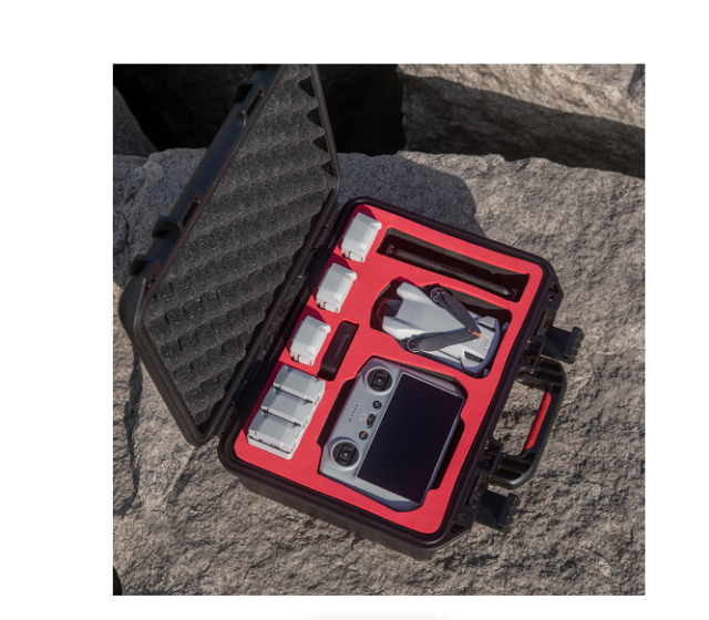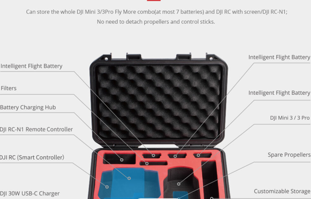 Notranjost kovčka je opremljena s precizno izrezanim penastim vložkom in penastim pokrovom, ki varno držita zložen DJI Mini 3 ali Mini 3 Pro, daljinski upravljalnik DJI RC ali RC-N1, do sedem baterij (vključno z eno v dronu), polnilno postajo, filtre, kable in rezervne propelerje. Zapiranje z dvojnim zapahom zagotavlja tesno zapiranje, medtem ko avtomatski ventil za sprostitev tlaka izenači notranji tlak med letom. Dodatne funkcije, kot so zložljiv ročaj za prenašanje in luknje za ključavnico iz nerjavečega jekla, izboljšujejo prenosljivost in varnost.