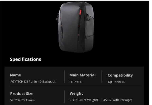 Nahrbtnik PGYTECH P-CB-245 za DJI Ronin 4D je integrirana rešitev, ki združuje varno shranjevanje in podporo za delovanje na poti za sistem stabilizatorja Ronin 4D. Nahrbtnik je zasnovan za prenašanje celotnega kompleta Ronin 4D in uporablja nastavljive predelke z zaponkami za učinkovito organiziranje stabilizatorja, baterij, objektivov in dodatkov.
