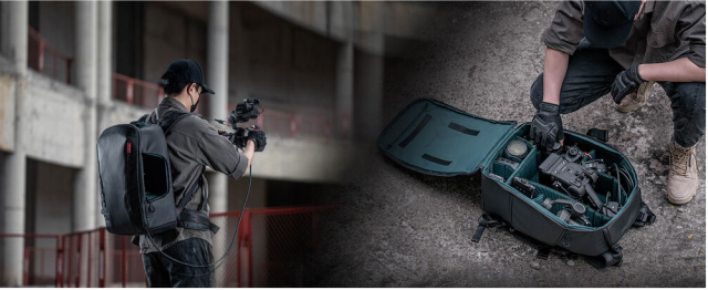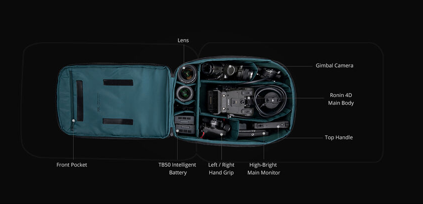 Poleg prevoza se ta nahrbtnik spremeni v mobilno operativno platformo zahvaljujoč vgrajenemu PGYTECH Beetle Clip, ki varno pritrdi glavno telo Ronin 4D znotraj nahrbtnika. Ta zasnova zmanjša velikost opreme, hkrati pa izboljša ravnotežje in udobje med delovanjem. Nastavljivi nosilci za kamero, skupaj z odstranljivimi pasovi za prsni koš in pasom, pomagajo enakomerno porazdeliti težo in znatno zmanjšajo utrujenost operaterja med daljšimi snemanji.