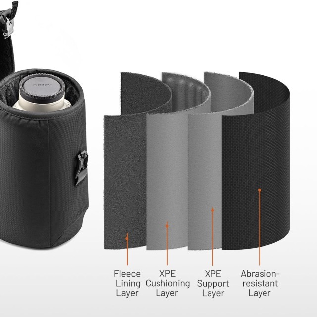 Zunanjost je izdelana iz trpežne tkanine, ki je odporna na brizganje vode in prah. Posebna zadrga s povečano odpornostjo proti vremenskim vplivom preprečuje vdor vlage. V notranjosti jepodloga iz spominske pene, ki se prilagodi obliki objektiva, absorbira udarce in preprečuje praske tudi pri pogosti uporabi.