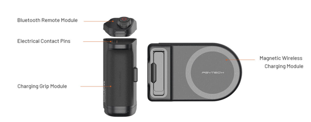 Modul za polnjenje ročaja vsebuje 3000-mAh litij-ionsko baterijo, ki brezžično polni vaš telefon prek magnetnega nosilca in deluje tudi kot power banka za daljše snemanje. LED-indikator stanja napajanja vas obvešča o preostali življenjski dobi baterije. Dvostranska magnetna zasnova omogoča pritrditev dodatne opreme, kot je LED-lučka, za razširjene ustvarjalne nastavitve.