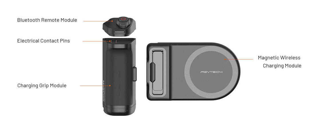 Njegova modularna zasnova ročaj spremeni v stabilen stojalo za gledanje ali snemanje brez uporabe rok. Odstranljivi večfunkcijski modul zaklopa se brezžično poveže prek Bluetootha in se lahko uporablja kot daljinski upravljalnik z razdalje do 10 metrov, kar vam omogoča zajemanje fotografij, zagon ali zaustavitev videa, povečavo in prilagajanje nastavitev brez dotika telefona (funkcije se razlikujejo glede na napravo in operacijski sistem).