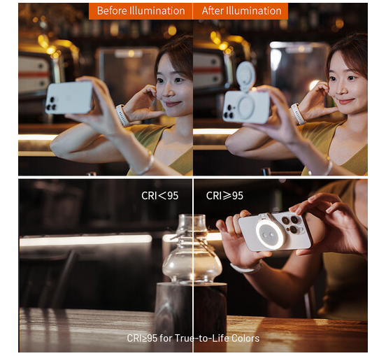 Svetilka ima 34 visoko učinkovitih LED-diod z indeksom barvnega upodabljanja (CRI) 95 in zagotavlja barvno natančno osvetlitev v treh izbirnih načinih: 9000 K hladna svetloba za ostre podrobnosti, 5500 K mehka svetloba za naravne selfije in 2500 K topla svetloba za večerno ali slabo osvetljeno okolje. 290° rotacija zagotavlja prilagodljive kote osvetlitve, medtem ko dva intuitivna gumba nadzorujeta svetlost in barvno temperaturo. Vgrajena 300 mAh litij-ionska baterija omogoča do 30 minut neprekinjene uporabe, polnjenje pa traja le 60 minut prek USB-C. MagGlow služi tudi kot stojalo za telefon za gledanje ali snemanje na mizi.