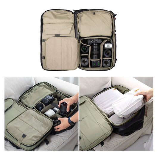 Nahrbtnik je zasnovan za največjo vsestranskost in ga lahko nosite kot tradicionalni nahrbtnik, potovalno torbo ali torbo prek ramena z odstranljivim pasom in dvojnimi zgornjimi trakovi. Vključuje oblazinjeni predal za prenosnike do 16 palcev, prilagodljivo pregradno steno z zadrgo za organizirano pakiranje, dvojne stranske žepe za dodatke in trakove za pritrditev dodatnega vložka za fotoaparat ali kompleta za shranjevanje oblačil. Za dodatno udobje ima nahrbtnik tudi skriti žep za AirTag, žepe za baterije, zložljiv vrh s sponkami in držalo za stojalo/stativ. Mrežasti prezračevani hrbtni del in trakovi iz pene, ki zmanjšujejo pritisk, zagotavljajo udobje med dolgimi potovanji, vključena zaščita pred dežjem pa nudi zaščito v vlažnih razmerah.