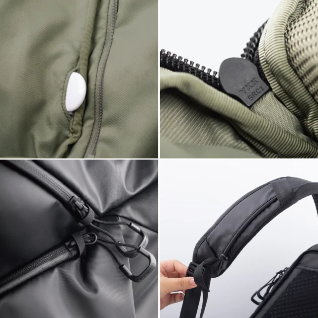 Poleg tega ima nahrbtnik skriti žep za AirTag, žepe za baterije in zapiranje z zvitkom in zaponkami za dodatno varnost. Zunanjost nahrbtnika je izdelana iz vodoodpornega poliestra in ima visokokakovostne YKK zadrge za trajnost in zanesljivo zaščito vaših stvari.