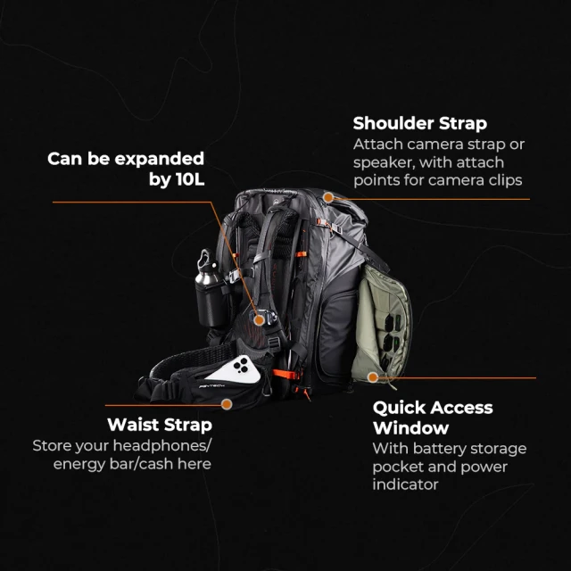 Nahrbtnik PGYTECH OnePro Flexs prostornino 50 litrov omogoča varno shranjevanje fotografske opreme, ki je vedno pri roki. Prostornino je mogoče v zgornjem delu dodatno povečati za 10 litrov.
