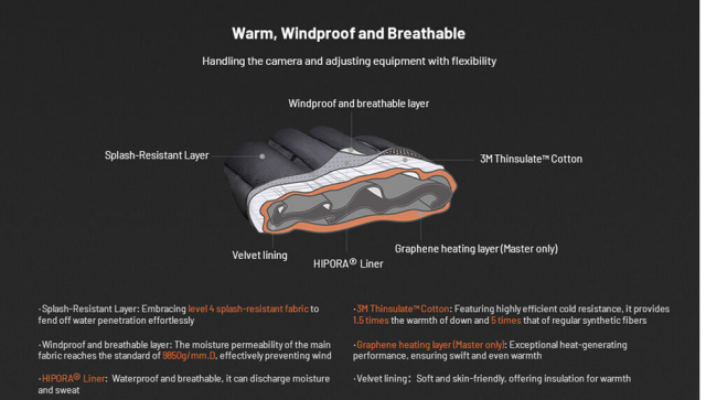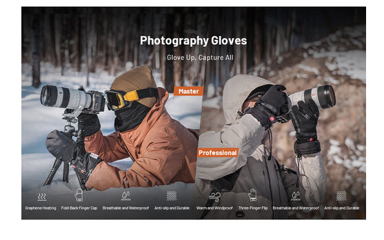 Rokavice združujejo bombaž 3M Thinsulate, vodoodporno in dihalno podlogo HIPORA, vetroodporno plast in tkanino, odporno proti brizganju, da vaše roke zaščitijo pred mrazom, vetrom in vlago. Oblazinjeni usnjeni dlani in SBR oblazinjenje izboljšujejo oprijem in udobje, medtem ko žametna podloga dodaja mehkobo in izolacijo. Zložljivi prstni pokrovi omogočajo enostaven dostop za natančno upravljanje kamere, zapestni trak in zaponka proti izgubi pa rokavice varno držita skupaj. Te rokavice so idealne za ekstremne temperature od -31 do 32 °F (-35 do 0 °C) in so najboljši spremljevalec za fotografiranje na prostem pozimi.