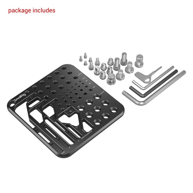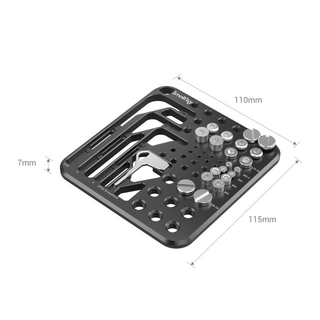 Plošča za shranjevanje vijakov in šestiložnih ključev SmallRig MD3184 je zasnovana za pogosto uporabljene vijake in šestiložne ključe za komplete kamer. Gre za ploščo za shranjevanje, ki vsebuje 4 šestiloročne ključe (3/16、3、4、2/ploščati izvijač) in različne vijake, kot so 2 1/4"-20 vijaka z ravno glavo, 8 1/4"-20 šestiloročnih vijakov za kletke, L nosilce, QR plošče, osnovne plošče, ročaje, palične objemke, zgornje plošče in monitorje, 2 vijaka s šestilasto glavo M4 in 2 vijaka M5, 2 vijaka s križno glavo M3 za montažo rozet, 2 vijaka M2.5 vijakov s šesterokotno glavo, ki se uporabljajo za zavarovanje kletke pred zvijanjem, in 2 vijaka s ploščato glavo 3/8"-16 za plošče QR in osnovne plošče. Zaščita proti navijanju je dosežena tako, da šestilo držite z magnetom in vijake namestite na navojne luknje. Za priročen in natančen dostop so na voljo jasne lasersko gravirane oznake specifikacij. Skladiščna plošča je opremljena s flanelom in luknjo za trak za enostavno shranjevanje in prenašanje.