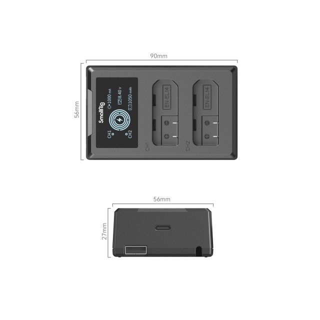 Polnilec baterij SmallRig EN-EL14 za fotoaparate 4082 je izdelan iz visokokakovostnega ognjevarnega materiala ABS+PC. Površina je matirana, odporna na visoke temperature, prijetna na otip in trpežna. Vgrajeni prostor za baterijo je enake velikosti kot originalna baterija fotoaparata, natančno se prilega prostoru za baterijo fotoaparata in se namesti brez zatikanja. Polnilec uporablja zasnovo z dvema režama, ki omogoča hkratno polnjenje dveh baterij.