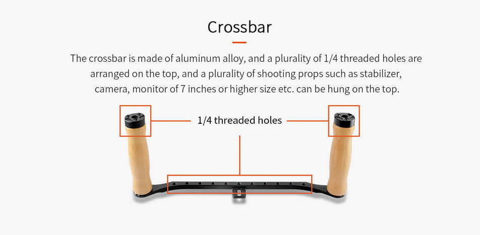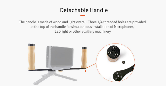 HD-1 je profesionalna ročna kletka, zasnovana za 7-palčne (in združljiva z 9-palčnimi) režiserske monitorje, izdelana iz trdne aluminijeve zlitine z ergonomskimi lesenimi ročaji za varen in udoben oprijem med daljšo uporabo. Vključuje več kot 17 strateško nameščenih 1/4-palčnih vijakov, ki omogočajo hkratno pritrditev monitorjev, stojal, brezžičnih video oddajnikov, V-oblikovanih baterij in plošč za ojačitev. Z kompaktno dolžino 360 mm in lahkotno konstrukcijo, ki tehta le 300 g, HD-1 zagotavlja enostavno prenosljivost brez žrtvovanja stabilnosti ali funkcionalnosti na snemalnem prizorišču.