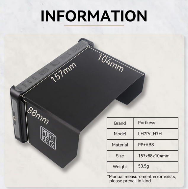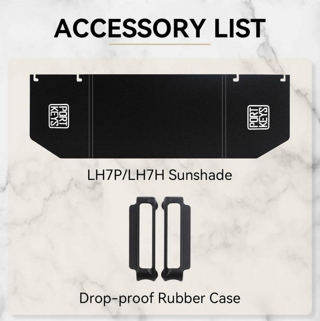 Portkeys LH7P/LH7H Sunshade je lahka, zložljiva kapica za monitor, zasnovana za zaščito 7-palčnih monitorjev LH7P in LH7H pred bleščanjem in sončno svetlobo, kar zagotavlja jasno vidljivost v zunanjih snemalnih okoljih. Izdelana je iz trpežnega materiala PP+ABS in tehta le 53,5 g. Ima kompaktno obliko 157 × 88 × 104 mm, enostavno namestitev in varno prileganje, dopolnjuje pa jo priloženo gumijasto etui za dodatno zaščito med prevozom.