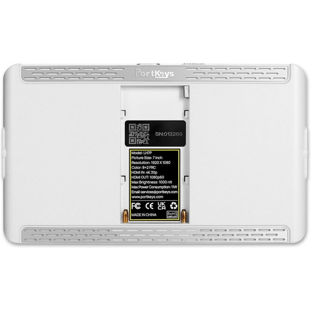Portkeys LH7P je 7-palčni monitor za kamero z visoko svetilnostjo (1000 cd/m2) na dotik in brezžičnim daljinskim upravljalnikom za Blackmagic Design BMPCC 4K/6K/6K Pro in Sonyjeve kamere (A1, A9II, A7C, FX3/FX30, RX10, A7SIII, A7MIV, RX0, A7MIII itd.). Ponuja tudi bogate programske funkcije, vključno s primerjavo videoposnetka z referenčno sliko JPG, ponovnim vzorčenjem 4K na 1080, izrezovanjem videoposnetka, anamorfnim popravljanjem slike, popravljanjem 3D LUT, navpičnim načinom snemanja videoposnetkov itd. Možnost bele barve.
