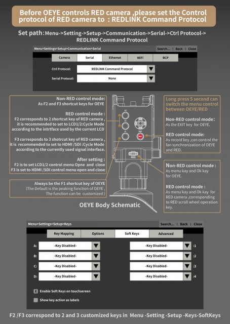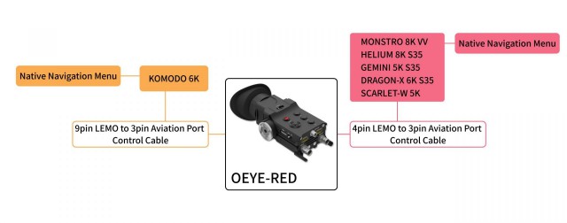 Iskalo za kamero PortKeys OEYE-RED OLED omogoča nadzor/navigacijo po menijih kamer RED Digital Cinema (MONSTRO 8K VV, HELIUM 8K S35, GEMINI 5K S35, DRAGON-X 6K S35) in ima vhod/izhod 3G-SDI (do 1080p60) ter hkratni vhod/izhod 4K HDMI (do 24 slik na sekundo v DCI 4K ali 30 slik na sekundo v UHD). Opremljen je z visokokakovostnim 0,71-palčnim zaslonom OLED (200 cd/m2, 100 000 : 1), tehta približno 400 g in porabi ~10 W. Seveda je na voljo korekcija dioptrije (+8D - -3D) in bogate programske funkcije, vključno s korekcijo 3D LUT, merjenjem signala, prikazom lažnih barv, pomočjo pri ostrenju, povečavo slike itd.