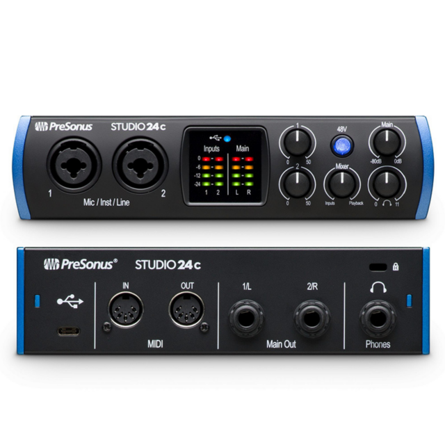 Ne glede na to, ali snemate svoj prvi album ali najnovejšo epizodo podcasta, Studio 24c vam bo pomagal, da boste slišali svoj najboljši zvok. Z dvema brezhibnima mikrofonskima predojačevalnikoma XMAX-L podjetja PreSonus® za snemanje vokalov, visokoločljivostnim predojačevalnikom za instrumente, s katerim lahko neposredno na vmesnik priključite kitaro ali bas kitaro, in profesionalnim merjenjem vhodov, s katerim lahko spremljate ravni snemanja, Studio 24c zagotavlja izjemno kakovost zvoka v robustni in kompaktni zasnovi. Zvočni vmesnik Studio 24c je popoln domači snemalni studio, saj je priložena brezplačna licenca za PreSonusovo nagrajeno programsko opremo za glasbeno produkcijo Studio One® Artist, tako da lahko takoj začnete snemati.