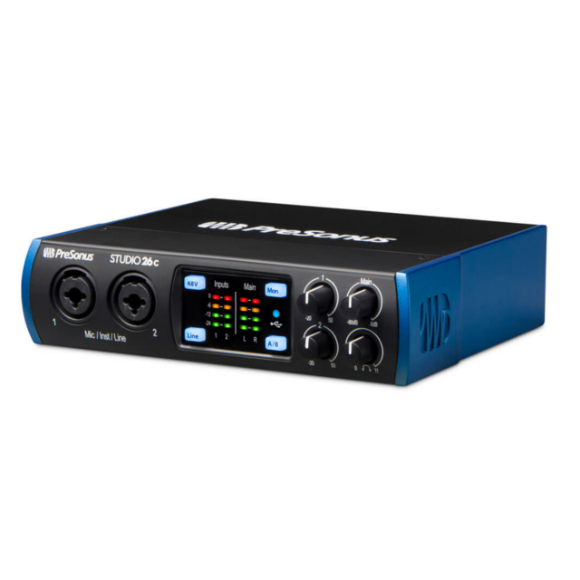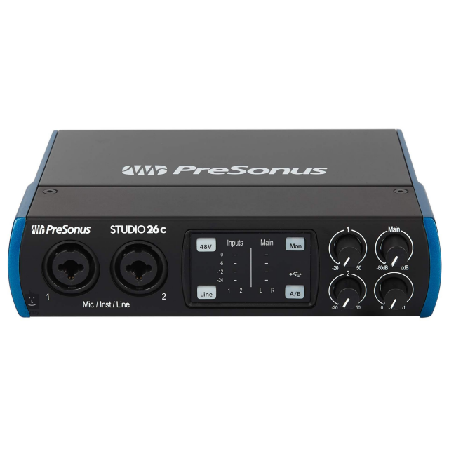 Studio 26c je zasnovan z mislijo na potrebe didžejev in elektronskih glasbenikov ter zagotavlja vrhunsko kakovost zvoka s profesionalnim merjenjem in prilagodljivimi možnostmi spremljanja. Z dvema brezhibnima mikrofonskima predojačevalnikoma PreSonus XMAX-L za snemanje vokalov in lastnih vzorcev, vhodi MIDI I/O in linijskimi vhodi za vaše najljubše sintetizatorje ter profesionalnim merjenjem vhodov in izhodov za spremljanje ravni snemanja in delovanja Studio 26c zagotavlja izjemno kakovost zvoka v robustni in kompaktni zasnovi. Zvočni vmesnik Studio 26c, ki je popoln snemalni studio že takoj, je opremljen z brezplačno licenco nagrajene PreSonusove programske opreme za glasbeno produkcijo Studio One® Artist, tako da lahko začnete ustvarjati takoj.