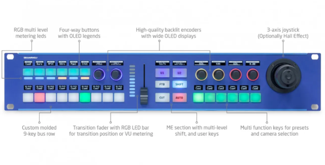 SKAARHOJ Rack Fusion Live z NKK, joystickom s Hallovim učinkom in tehnologijo Blue Pill Inside je profesionalna nadzorna plošča za oddajanje, nameščena v stojalo, ki združuje gumbe za izbiro kamere NKK, joystick s Hallovim učinkom in tehnologijo Blue Pill Inside za napredno upravljanje večsistemskih PTZ-kamer in preklapljanje v živo.