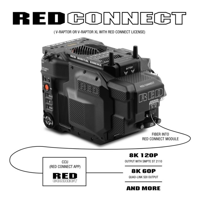 Modul RED Connect se poveže s kamerami V-RAPTOR ali V-RAPTOR XL (V-Lock) in omogoča pretakanje videoposnetkov 8K v živo prek aplikacije RED Connect. RED Connect uporabnikom omogoča pretok datotek RAW R3D neposredno iz sistemov kamer V-RAPTOR in V-RAPTOR XL prek protokola IP v krmilno enoto kamere (CCU) v realnem času, kar odpira izjemen nabor ustvarjalnih aplikacij, od neposrednega pretakanja do virtualne produkcije in prave produkcije 8K VR.