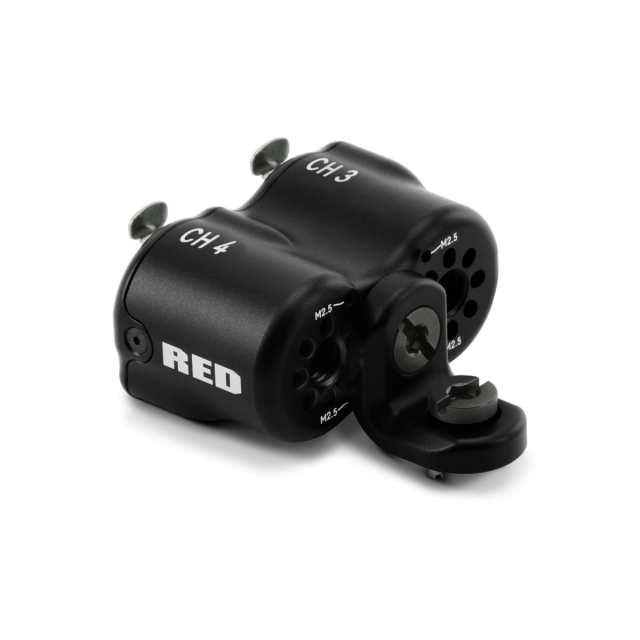 Adapter DSMC3™ RED® iz 5-pinskega na dvojni XLR je kompaktna rešitev za razdružitev 5-pinskega vhoda ODU na dva 3-pinska vhoda XLR. Adapter lahko zagotavlja 48-voltno fantomsko napajanje z mikrofonskim in linijskim vhodom ter se enostavno namesti na vaš V-RAPTOR® z vijakom ⅜-16.