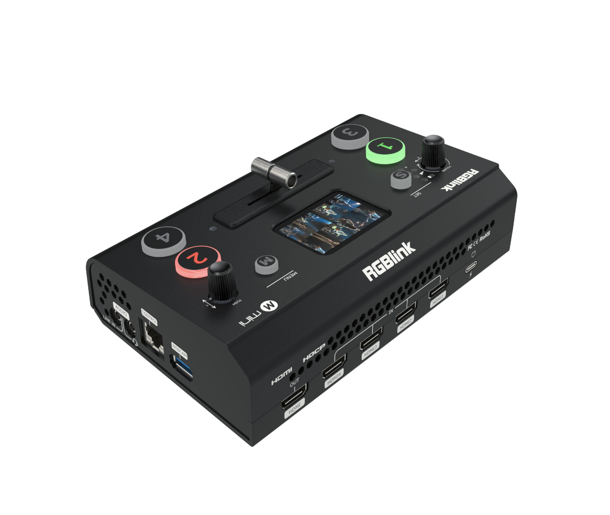 Mini 2022 live production switcher RGBlink združuje preklapljanje, spremljanje, mešanje zvoka in pretakanje v eni kompaktni enoti. Opremljen je s štirimi vhodi HDMI 1.3 in enim izhodom HDMI, podpira 6-slikovni multiview, kar operaterjem omogoča hitro preklapljanje med predogledom in programskimi izhodi za zanesljivo preklapljanje v živo. Vgrajen 2,1-palčni barvni zaslon TFT omogoča spremljanje signala v realnem času in intuitivno navigacijo po meniju.