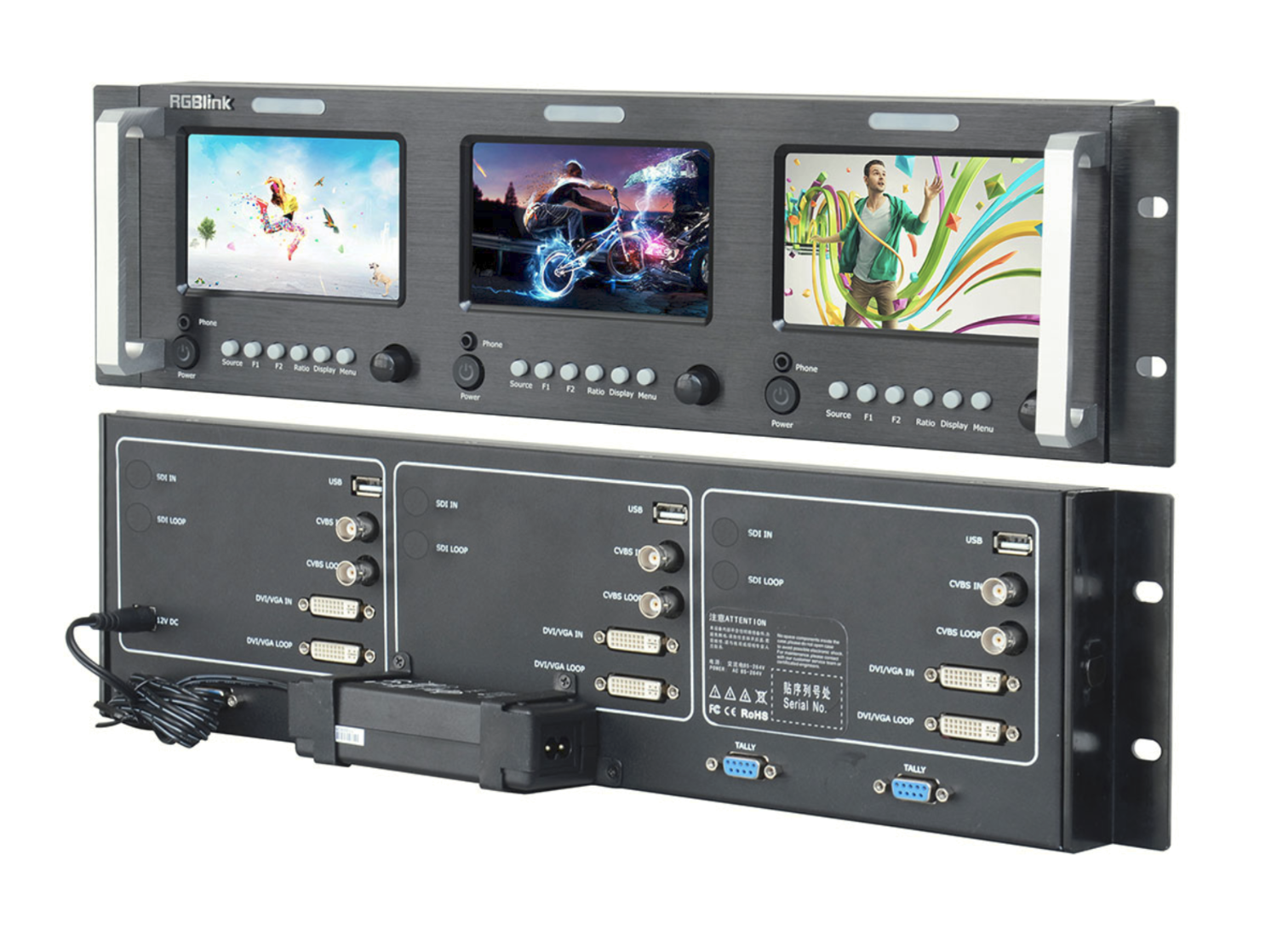 RGBlink RMS 5533S je profesionalna 19-palčna 3RU LCD-monitorna rešitev za vgradnjo v stojalo, zasnovana za okolja oddajanja, studijske in mobilne produkcije. Vključuje tri neodvisne 5-palčne LCD-zaslone, vsak z izvirno ločljivostjo 800 × 480 in nastavljivim razmerjem stranic 16:9 ali 4:3, kar omogoča hkratno spremljanje več video virov v kompaktnem stojalu. Vsak zaslon podpira neodvisno upravljanje vhodov in zagotavlja široki zorni kot za jasno vidljivost v gosto nameščenih stojalih.