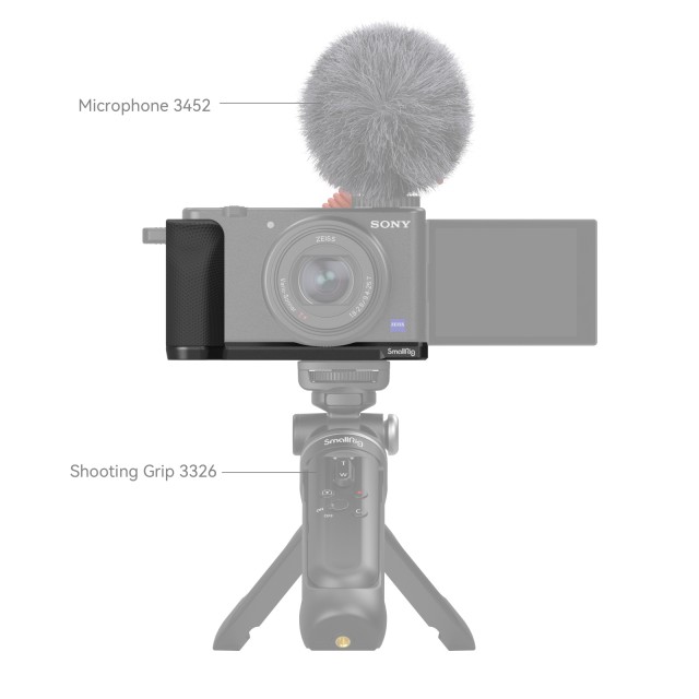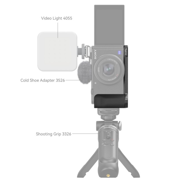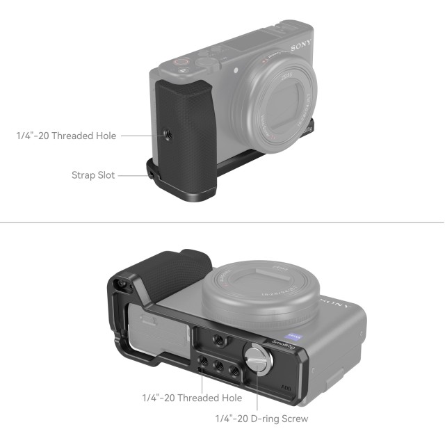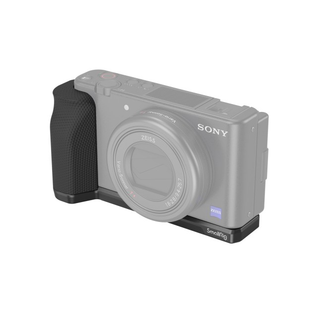 Držalo SmallRig za Sony ZV-1F 4146 je zasnovano za boljši oprijem, zaščito spodnjega dela kletke in lažje navpično fotografiranje. Ergonomski silikonski ročaj se pritrdi z enim vijakom 1/4"-20 D-obroča, ima trdnejši oprijem, ki preprečuje nenamerne padce, in eno luknjo z navojem 1/4"-20 na sredini desne strani objektiva za brezžično držalo 3326 za portretno fotografiranje. Držalo ima na dnu tudi luknje z navojem 1/4"-20 za pritrditev ploščice za hitro sproščanje in luknje za trak na spodnji plošči za ročni trak PSW2398.